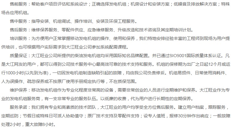 大江旺業(yè)提供各種型號規(guī)格移動發(fā)電機組銷售、出租、維修、保養(yǎng)及安裝服務(wù),信譽保證,價格公道,歡迎新老客戶來電咨詢。